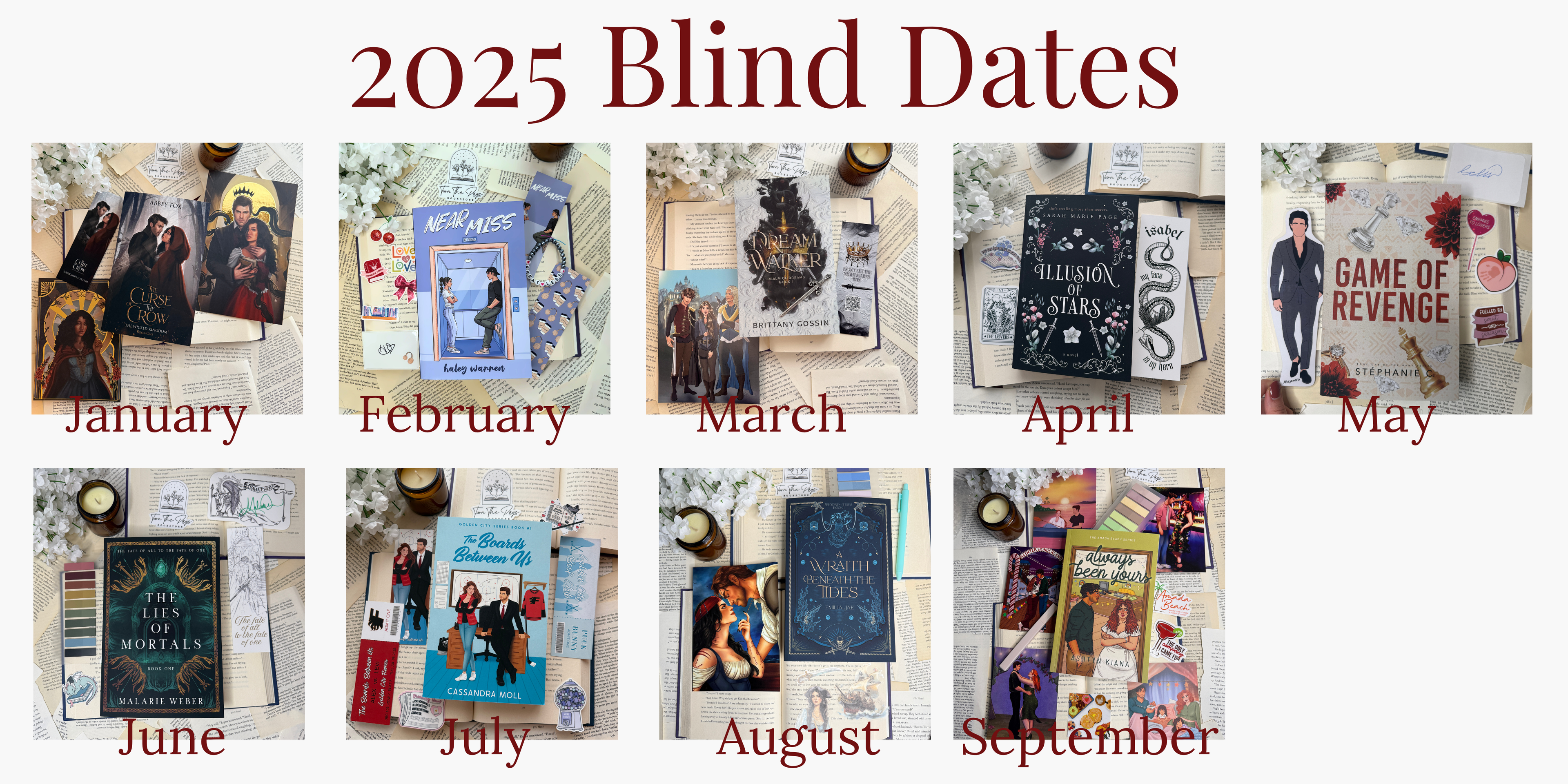 Each Blind Date includes one book, annotation tabs, pen or marker, and stickers. Sometimes, an author will provide goodies, which could include a signed book or bookplate, bookmark, themed stickers, and/or character art. These will be announced IF the author includes them.